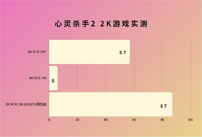 第三款游戏我们选择了《心灵杀手2》;由于画面细节逼真,本作也被誉为新一代的显卡杀手,我们自然不会错过这样的测试机会,将画面预设开至最高,1080P、2K的原生画质分别达到85帧、57帧;在打开RTX光线追踪后,依旧是熟悉帧数暴跌,但伴随着DLSS 3.5的开启,游戏帧数得到巨幅提升,1080p达到了流畅的121帧,2K分辨率达到87帧。帧数综合提升将近62%