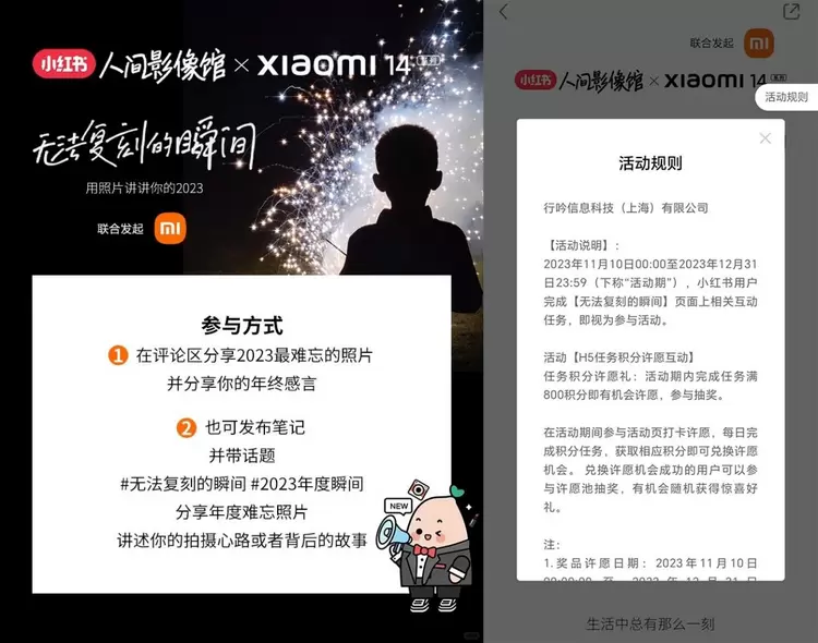 本次活动以小红书官号 @新品薯 @城市情报官联合发布「无法复刻的生活瞬间」官方短片拉开序幕,邀请用户分享人生照片、并在跨年阶段用无法复刻的瞬间总结2023。与此同时,平台设置积分许愿专区,吸引用户完成活动并许愿,用户满足相应分值后即可许愿,获得小米惊喜好礼。