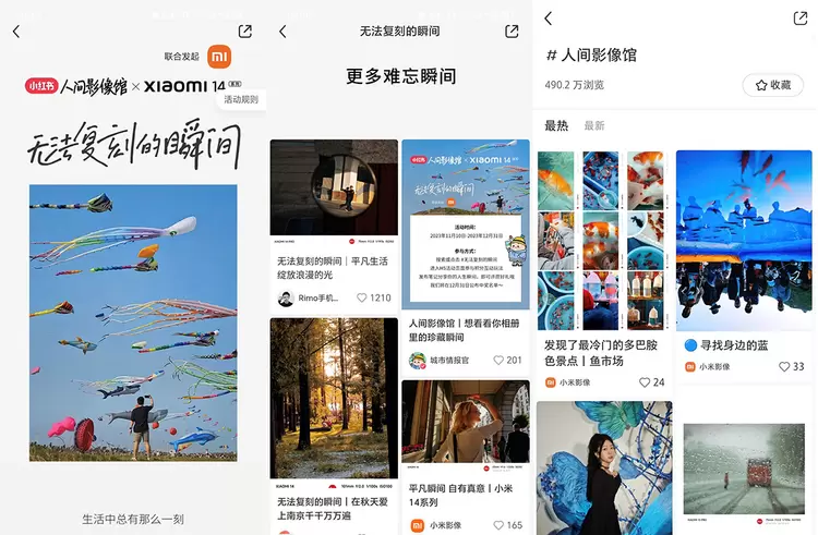小红书联手小米,洞察站内影像赛道的大热趋势,伴随小米14系列的全新上市,联动IP“人间影像馆”作为营销阵地,线上定制话题#无法复刻的瞬间,呼吁用户使用小米14系列,在徕卡光学的加持下,⽤真实、充满细节的画质表现,拍下那些值得被纪念的、被记录的、被打动的瞬间。活动在传递小米14系列出色影像实力的同时,与用户⼀起共创真实、动⼈的影像故事。