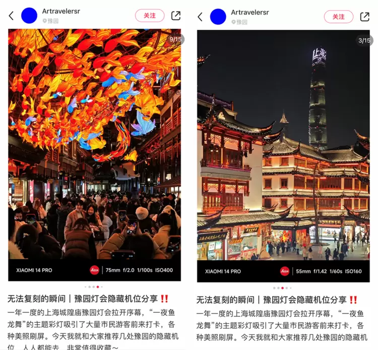 一年一度的上海城隍庙豫园灯会,被中国国家地理合作摄影师@Artravelersr 记录下来,游客和一夜鱼龙舞的彩灯相辅相成、年味十足,小米14Pro即使是夜景也能做到暗部有细节,呈现高级影调质感。