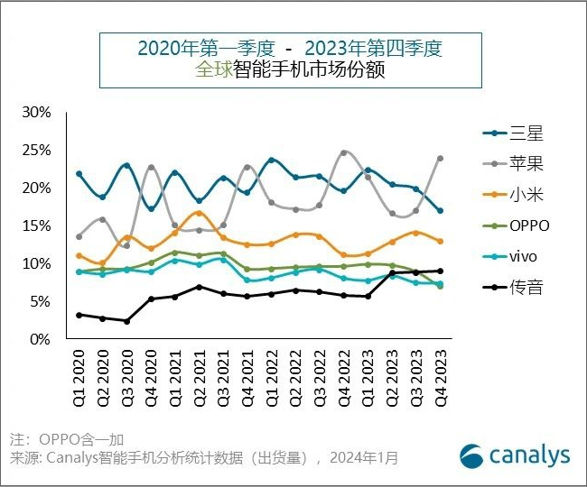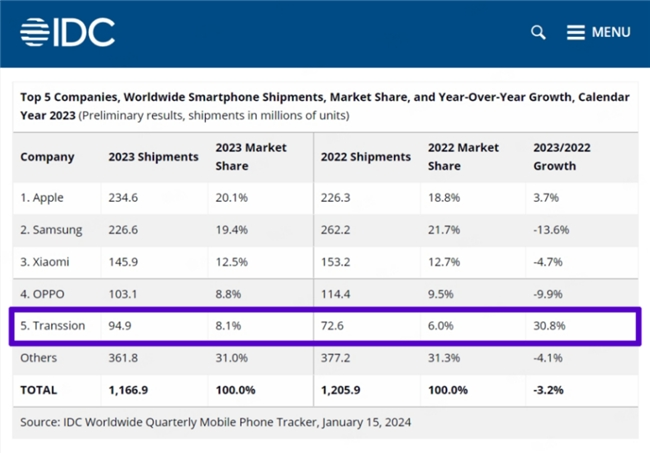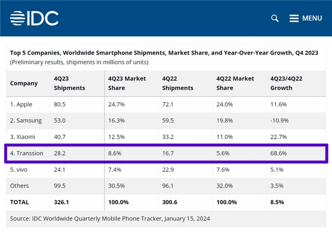 2023年第四季度:传音首次跻身全球智能机市场第四