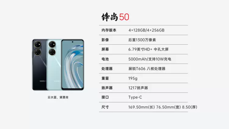 本次发售的酷派锋尚50共有黛墨青、云水蓝两款配色可选,提供了4GB+128GB和4GB+256GB两种配置选择,支持EROFS内存融合技术,4GB运行内存带来8GB运存体验。官方建议零售价分别为699元和799元。这款手机将在社会公开渠道售卖,感兴趣的网友可以前往附近的零售店咨询体验购买。