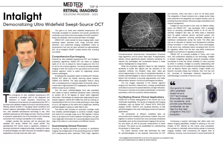 近日,享誉全球、美国著名的医疗科技杂志Medtech Outlook发布了2023年度全球最佳眼底影像设备品牌(Top Retinal Imaging Solutions Provider 2023),Intalight赛炜如意全眼OCT(DREAM OCT)凭借卓越的硬件技术和强大的软件算法实力登榜,与众多世界前沿的知名品牌共同跻身顶级前十。Medtech Outlook致力追踪医疗科技领域的最新趋势、挑战和创新解决方案,每年从全球范围内遴选不同细分领域的顶尖提供商。此次Intalight赛炜斩获这一世界殊荣,代表了全球眼科学术界对DREAM OCT的高度认可,再次展现了其在海外市场的广泛影响力。