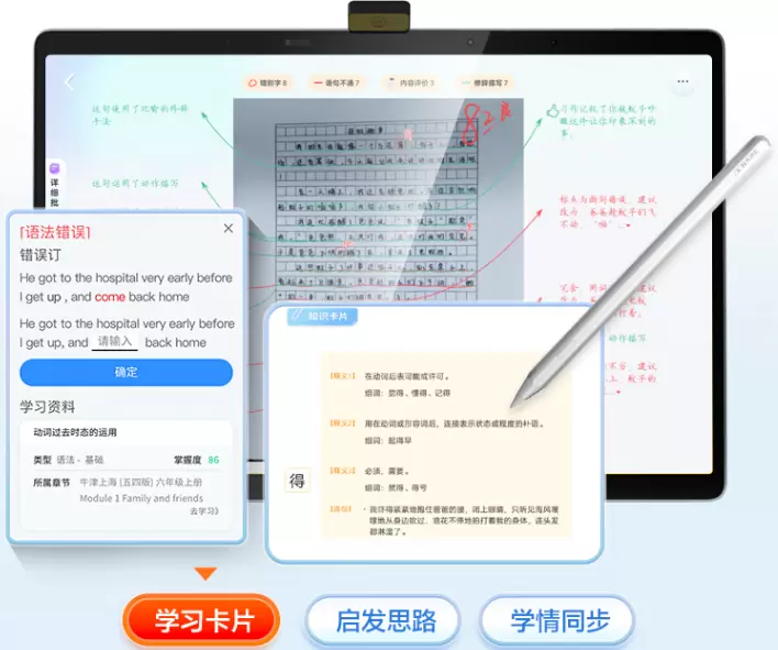 中英文作文类人批改功能一改传统学习机只能针对字词标点纠错、识别句式修辞错误这些基础内容进行批改的做法,不但可以围绕写作要求、全篇结构和文采等方面,像老师一样,实现对学生作文的层层批改点评,让作文批改更高效。而且能启发写作思路,利用AI润色技术生成片段优化参考和写作建议提升,让孩子在启发中精准提升。