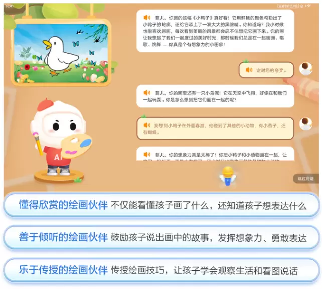 AI创意画板,内置AI绘画伙伴小飞。基于大模型对图像的理解能力,小飞可以从绘画作品的主题、主体、氛围、细节等角度深入解读孩子的作品,它不仅可以看懂孩子画了什么,还能理解孩子想要表达的情感和意义。