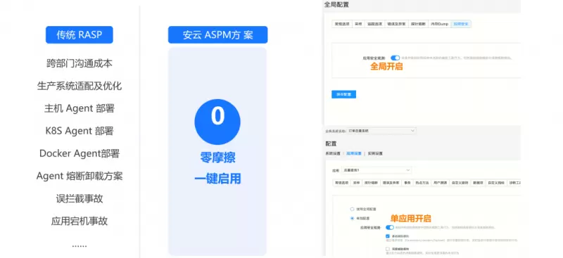 基于听云APM 现有 UniAgent 的可观测性数据,客户可以随时一键开启代码级实时运行态安全能力,安全部门不再需要面对 Agent 部署、降级、卸载等难题,不再需要面对跨部门沟通摩擦。
