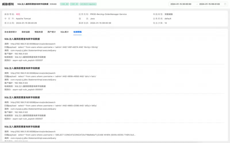 针对入侵事件,安云ASPM 支持自动关联请求、Trace、SQL 等多维度上下文信息,提供了攻击统计、请求追踪、用户统计、SQL 统计、检测策略等强大的安全分析能力,快速洞察安全事件全貌,极大提高分析效率,帮助客户及时采取行动加强防御,从而实现主动安全风险防御。