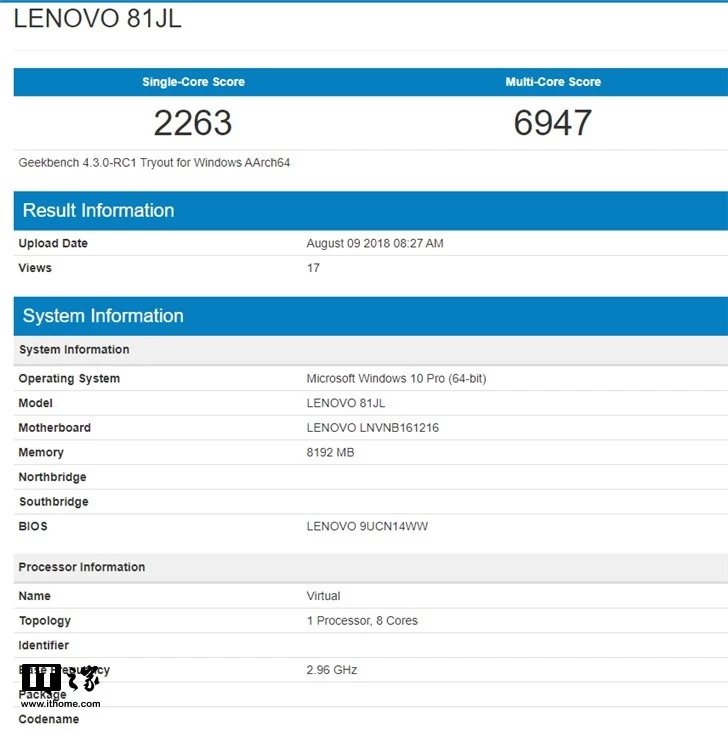 根据GeekBench提供的消息,这款笔记本运行的是Win 10 Pro系统,内存达到了8GB,而频率可以达到2.96GHz。跑分方面单线程2263分,多线程6947分,不过考虑到Win10系统基于exe来编译ARM架构,因此不能简单地将Win10版的GeekBench与移动版GeekBench进行简单比较。