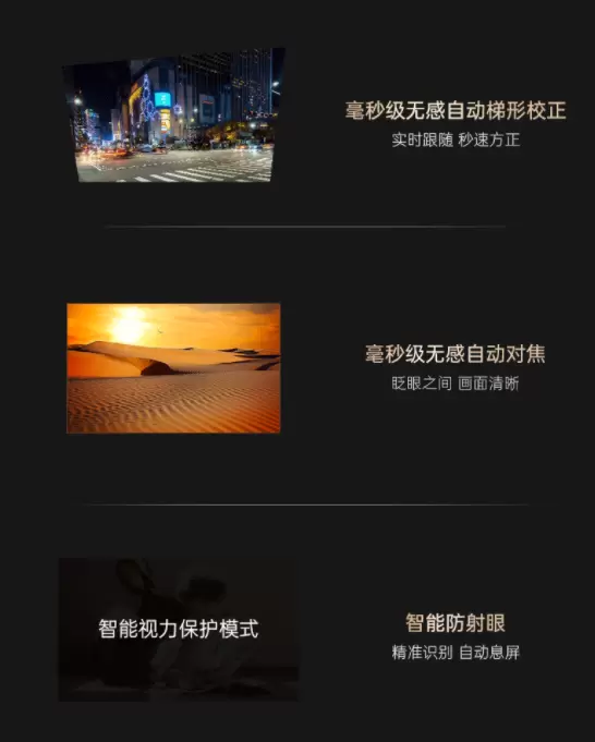 为了使用方便,选择支持自动对焦和自动六向梯形校正的投影仪,这样就不需要手动操作,用户可以轻松上手,即开即用。另外,如果需要搭配幕布使用的,则还需要支持自动入幕以及智能避障功能。