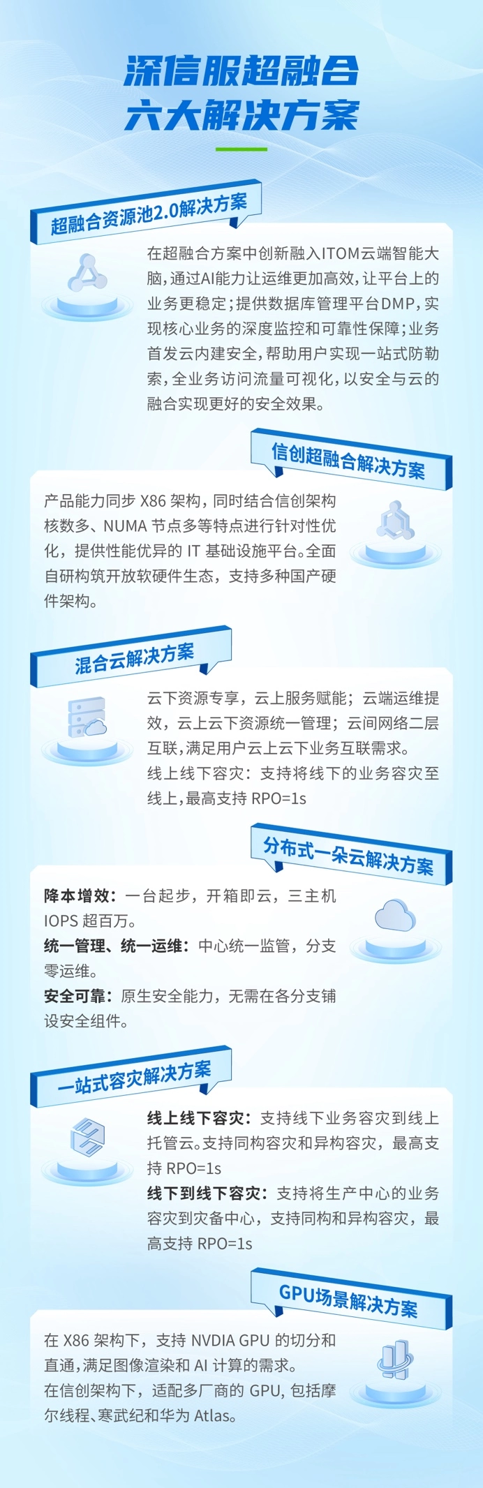 在能力的进化之外,深信服超融合解决方案也有全新升级。基于超融合的核心能力与价值,深信服提供六大超融合解决方案,充分满足用户的各种需求。