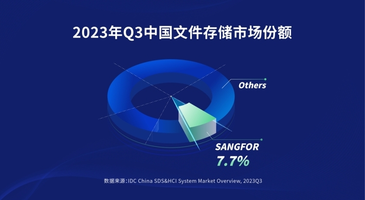 近日,国际数据公司(IDC)发布《中国软件定义存储(SDS)及超融合存储(HCI)系统市场季度跟踪报告,2023Q3》。报告显示,2023年第三季度,深信服EDS存储以7.7%的市占率位列中国文件存储市场第五。