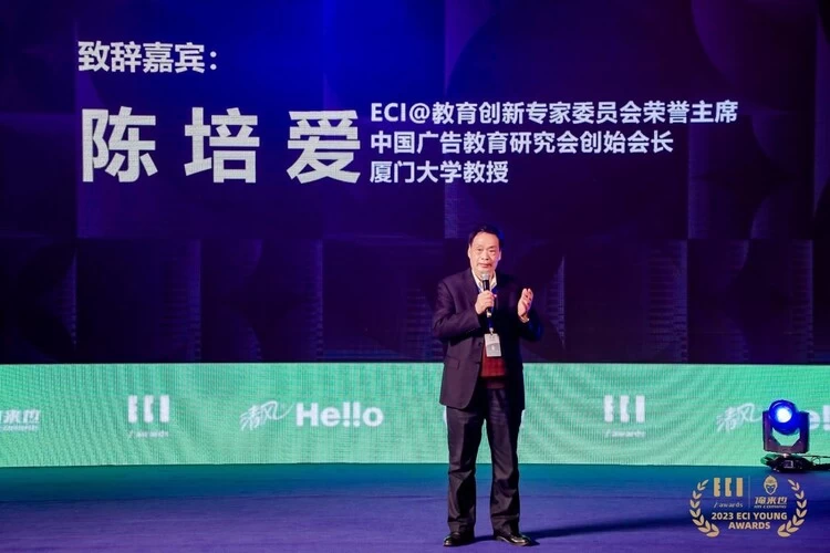 紧接着, ECI@教育创新专家委员会荣誉主席&中国广告教育研究会创始会长&厦门大学教授陈培爱先生上台发言,陈教授对大赛的举办意义表示高度认可,他表示:“相信这次大赛会成为高校大学生在数字化创新转型中非常重要的平台之一,把我们的专业教育价值提高到一个新的水平。
