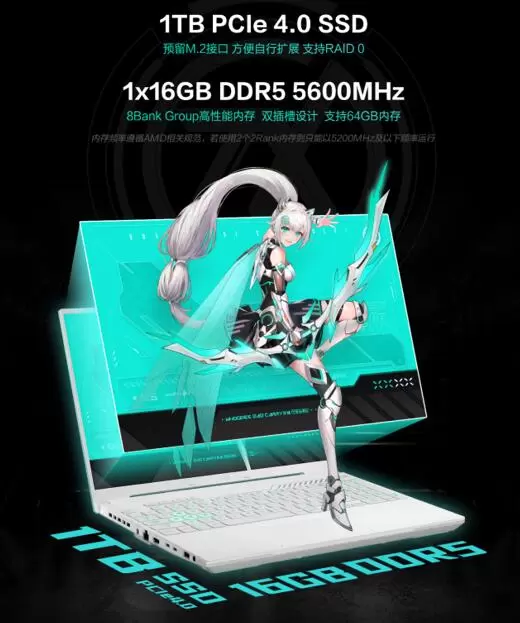 存储配置方面,天选5 Pro搭载了单条16GB DDR5 5600MHz内存,8BG高性能版本,预留内存插槽,方便用户自行升级。1TB PCIe 4.0 SSD可以应对大多数存储压力,并支持额外加装SSD组建RAID0,实现速度成倍提升。