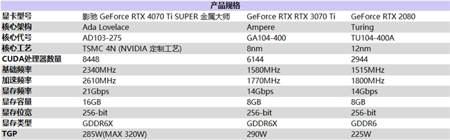 首先来看一下影驰GeForce RTX 4070 Ti SUPER 金属大师 的规格参数与GeForce RTX 3070 Ti 和GeForce RTX 2080 的对比: