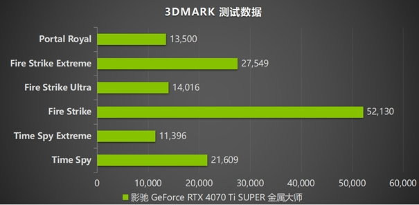 在3DMark TimeSpy DX12 测试中,影驰GeForce RTX 4070 Ti SUPER 金属大师的显卡分数达到了21609分。在3DMark Fire Strike DX11测试中,则是为52130的优异成绩。该分数证明了,该卡的性能足以让玩家流畅运行市面上的大多数游戏,实现高刷新率的需求。而对于在意光追游戏的用户而言,3DMark Portal Royal光追测试的分数可以表明,影驰GeForce RTX 4070 Ti SUPER 金属大师在运行3A光追游戏大作时的性能体现,可以说是优良,分数达到了13500。
