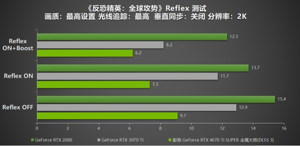 《反恐精英:全球攻势》这款游戏,相信对于爱好射击类游戏的玩家们一定不陌生。凭借着显卡本身强悍的性能发挥,再加上NVIDIA Reflex 的加持,为玩家们带来更为出色的响应速度,系统延迟的问题将进一步解决。可以看到在游戏实测中,影驰GeForce RTX 4070 Ti SUPER 金属大师 即便是在2K分辨率下,最优成绩可以达到6.2ms。相信通过该卡的加持,玩家们在射击游戏中将可以拥有别样的制胜优势。