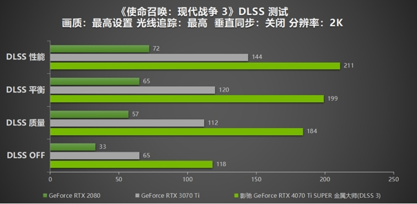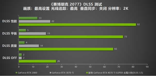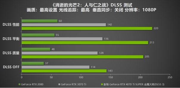 此次游戏部分,为了更能体现出影驰GeForce RTX 4070 Ti SUPER 金属大师 的性能实力,选择了对于硬件拥有着不同程度要求的三款热门游戏大作——《赛博朋克2077》、《消逝的光芒2:人与仁之战》以及《使命召唤:现代战争 3》。画面分辨率选择1080P和2K,均一致开启最高画质以及光线追踪技术。游戏实测将对比影驰GeForce RTX 4070 Ti SUPER 金属大师、GeForceRTX 3070 Ti和GeForce RTX 2080三张显卡之间的性能表现,同时也将通过开启NVIDIA DLSS 技术前后帧数的对比,让用户更直观的了解到NVIDIA DLSS技术的强悍表现。(注:影驰GeForce RTX 4070 Ti SUPER 金属大师 将开启DLSS 3/3.5技术,GeForceRTX 3070 Ti和GeForce RTX 2080将开启 DLSS 2技术。)