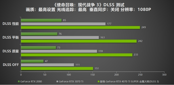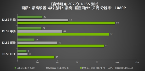 在均不开启DLSS 技术加持下,影驰GeForce RTX 4070 Ti SUPER 金属大师 的性能表现也是非常优异的。该卡在1080P下的帧数能高达143帧。而在该数据对比中,能明显的感受到NVIDIA DLSS 3 技术的强悍之处。在均未开启时,GeForce RTX 3070 Ti 与影驰GeForce RTX 4070 Ti SUPER 金属大师 之间的差距为30帧左右。而在分别开启DLSS 3.5和DLSS 2性能模式后,两者之间高达80帧左右的差距。