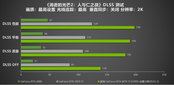 在2K模式下的影驰GeForce RTX 4070 Ti SUPER 金属大师 依旧能跑到超越百帧的成绩,达到了139帧。开启DLSS 3模式后的帧数也是分别到达182帧、190帧和198帧。可以说是可以完美运行《消逝的光芒2:人与仁之战》。