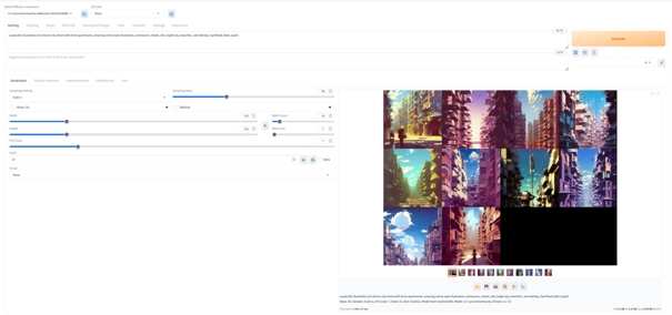 在SD XL测试下提示词为:“a peaceful illustration of a future city street with brick apartments, amazing anime style illustration, animecore, robots, 16k, bright sky, beautiful, John Berkey, Syd Mead, Bob Layzell”。分辨率则设定为1024x1024尺寸。采样50步、CFG SCALE 7的配置生成10批单张图片进行性能测试。