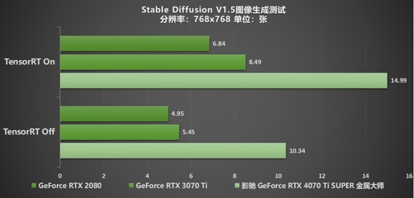 对于768x768规格的图像生成而言,在开启TensorRT 加速后影驰GeForce RTX 4070 Ti SUPER金属大师 的生成速度也是突破了每分钟10张的成绩,接近可生成图像15张。