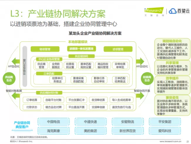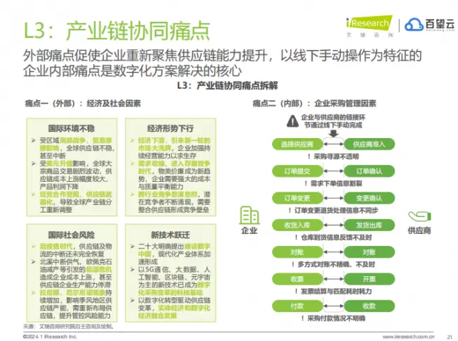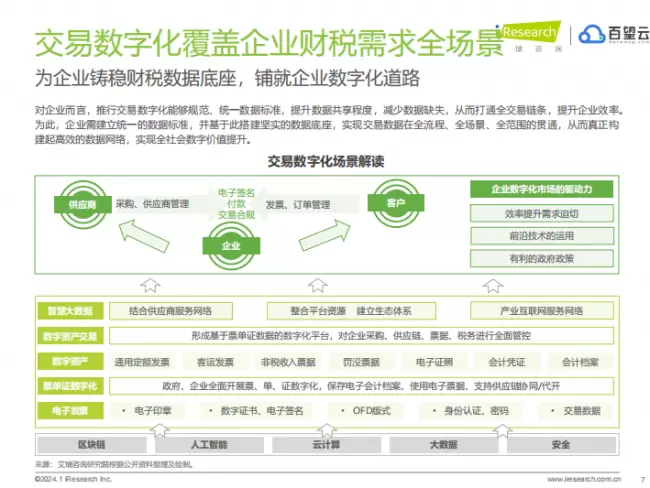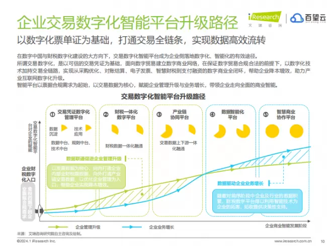 艾瑞咨询携手百望云,针对其服务2000家集团型企业、1700万家成长型企业的经验,沿着商业交易的自然脉络(包括但不限于采购优化、对账结算、电子发票、智慧财税到技术融资等交易关键环节),梳理出企业进行数字化的演进路径。
