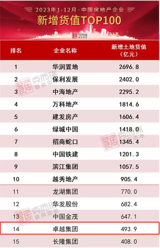 当前,我国房地产市场正处在调整转型的过程中,不少房企在拿地时都选择了更为谨慎的态度。然而,对于房企而言,充足的土地储备是企业发展的基石。2023年,卓越置业集团有限公司(以下简称:卓越集团)新增土储货值高达493亿元,不仅为自身未来发展打下坚实基础,更在克而瑞发布的2023年1-12月中国房地产企业新增货值TOP100榜单中位列TOP14,彰显作为头部房企的卓越实力。