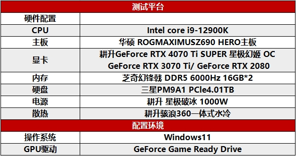 在本次测试中,选择了Intel Core i9-12900K作为CPU,搭配ROG MAXIMUS Z690 HERO主板。内存方面,采用了2条芝奇 幻锋戟 DDR5 6000Hz 16GB,而电源则选用了耕升星极破冰1000W电源。在散热方面,使用了耕升 骇浪360 一体式水冷。这套精心搭配的配置能够为GPU提供足够的降温和稳定供电,确保耕升 GeForce RTX 4070 Ti SUPER 星极幻姬 OC在正常使用中能够充分发挥其性能。同时,本次测试将直接与GeForce RTX 3070 Ti和GeForce RTX 2080进行对比,让我们一同探索耕升 GeForce RTX 4070 Ti SUPER 星极幻姬 OC的卓越表现。