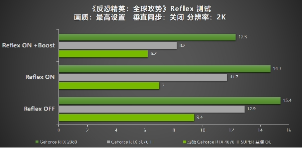 《反恐精英:全球攻势》作为一款风靡全球的多人射击游戏,低延迟和高响应速度对于提高射击游戏中的表现至关重要。它们可以提升用户的反应时间,减少错误,增加命中率,从而提高游戏体验和竞争力。在射击游戏中,高延迟会导致射击、移动和敌人位置的显示有延迟,这使得精确瞄准和及时反应变得困难,而低响应速度可以更快地显示用户操作的结果,这在进行快速瞄准和射击时尤为重要。而NVIDIA Reflex的加持配合上影驰 GeForce RTX 4070 Ti SUPER 星曜 OC优异的性能发挥,在1080P下的结果可以达到5.1ms,而在2K分辨率下也依旧可以达到6.2ms。