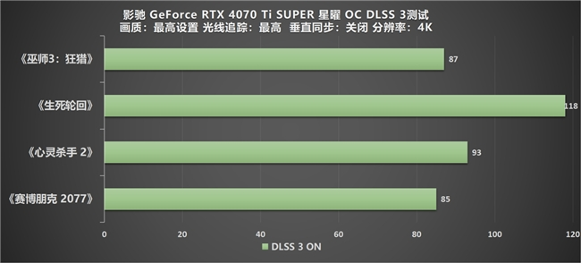 通过实测数据可以得知,在各款游戏中,即便在如此高分辨率的严峻环境下,影驰 GeForce RTX 4070 Ti SUPER 星曜 OC 也依旧可以都达到60帧以上的流畅表现。特别是在《赛博朋克 2077》中,凭借着其性能本身的优异,加上NVIDIA DLSS 3技术的强悍加持,帧数也达到了85帧。