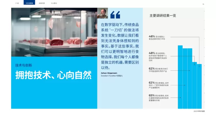 但创新的食品科技也带来了两难的纠结点。利乐全球总裁兼首席执行官欧黎卫在《2023年利乐指数》中揭示了这一点:新一代消费者清楚地认识到身边正在发生的变化。他们将技术视作改善健康、促进可持续发展、实现公平未来的关键因素,但同时也有部分消费者对创新持谨慎态度,认为食品越天然越好。《2023年利乐指数》的调研数据也佐证了这一观点:全球65%的受访者认为,技术在健康领域的应用将变得越来越重要,62%的受访者认为技术将对一个更可持续的未来产生重要影响。48%的受访者认为,技术有助于确保每个人都能获得健康的食品和饮料。然而,也有46%的受访者表示,食品创新花样繁多,担心对其健康不利。
