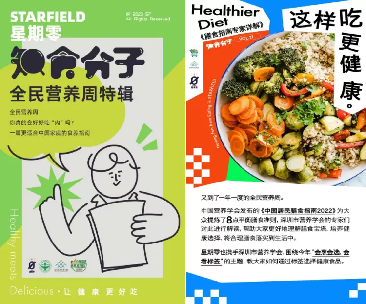 为了进一步普及健康营养知识,2022年和2023年全民营养周期间,星期零就作为深圳市全民营养周支持单位,携手深圳市营养学会、深圳市国民营养健康指导委员会、深圳市广电集团等,围绕每年的全民营养周主题,通过联合拍摄营养科普视频、制作营养知识海报等形式,共同宣传营养健康知识,推动健康均衡饮食习惯的形成。