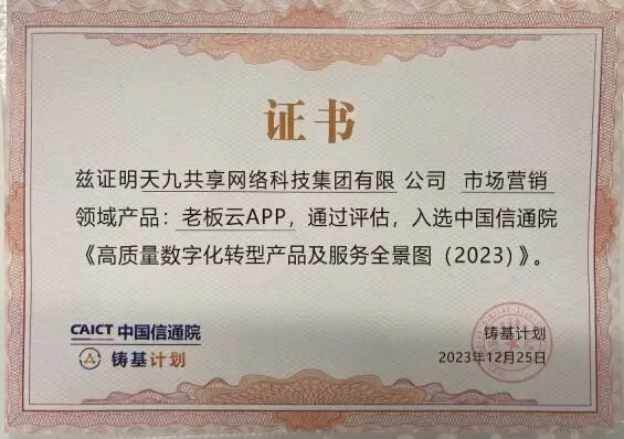 近日,中国信息通信研究院(以下简称“中国信通院”)发布了《高质量数字化转型产品及服务全景图(2023)》。天九老板云APP凭借其出色的企业数字化赋能优势成功入选,并加入到中国信通院数字化转型产品目录中。