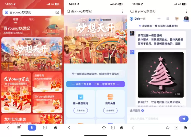在搜索会场首页,百度营销与文心一言策划了“妙想天开——AI带你花式玩转双旦”的互动板块。借助文心一言强大的中文理解能力及多模态生成能力,用户仅通过对话就能够生成一棵圣诞树、一张新年头像,还可以让文心一言帮忙策划一个活动方案、推荐浪漫的氛围布置方案、推荐餐厅等。天马行空、充满想象的体验为用户创造了各种独特的节日记忆,充分满足用户送礼、美食、休假、旅行多个场景需求。