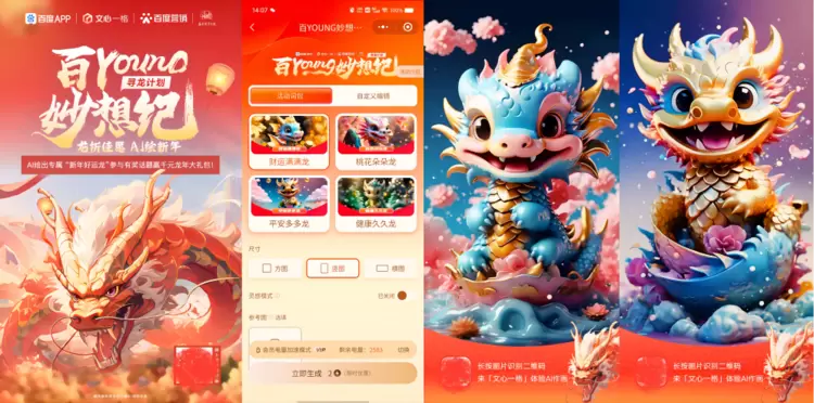 此外,百度营销还携手AI艺术和创意辅助平台文心一格打造了AI新春创作活动——“寻龙计划”,用户可以通过文心一格AIGC创意定制龙年海报,仅需选择活动词包,就可以生成风格各异的充满创意的新年好运小龙形象,还可以分享龙年海报,邀请更多的用户参与体验,共同感受龙年的节日氛围和AI作画的魅力。