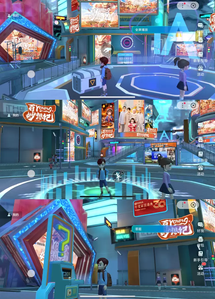 在希壤mini百Young妙想纪主题会场里,沉浸式的节日氛围街区、游戏化的互动体验让用户乐在其中。会场里贴心地设置了各种新奇玩法:在街区里散落着各种宝箱,用户可以在街区里体验拆宝箱的快乐,各种道具卡券随机掉落,惊喜不断;移动手指找到街区里的跳舞区域,轻点图标就能跟好友一起共舞;找到答题机器,正确答题后就有机会获得惊喜礼品。更值得一提的是,2023年12月31日,街区里一场盛大的烟花盛宴如约而至,让全国各地的用户跨越了时空的界限,在希壤元宇宙的街区里一起欢乐跨年。