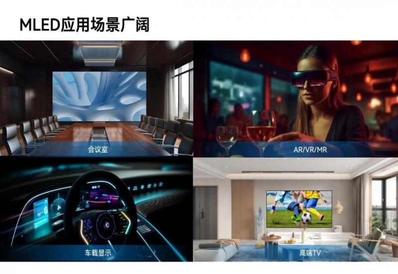 相对于传统LED显示,MLED显示具有高亮度、高分辨率、低功耗、高集成、高稳定性等特点,色彩保真、寿命长、稳定性好,被视为下一代显示方案,可广泛应用于从最小到最大尺寸的任何显示场合。从室内外专业大屏,到电影院屏幕、虚拟拍摄、智能车载显示,再到消费级平板显示,以及AR/VR/MR、空间显示、柔性显示、透明显示、可穿戴显示及光通信、光互联、医疗探测等领域。