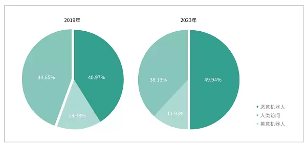 近年来,企业数字化进程的步伐持续推进,大规模针对性网络攻击行为增加。报告指出,过去5年,由Bots产生的流量明显高于正常访问流量,并且呈现出持续增长的趋势。Bots访问流量占比已经从2019年的55.35%增长到2023年的61.87%,其中恶意Bots的占比更是从40.97%增长到49.94%。