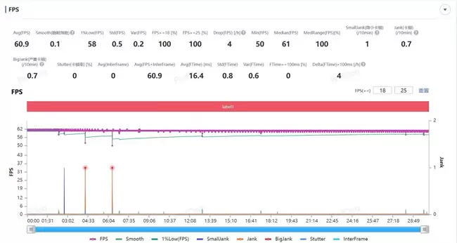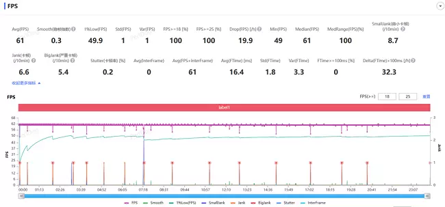 在同样吃性能的《崩坏:星穹铁道》中,进行30分钟跑图测试,ROG 8的表现也十分稳定。平均帧率达到了60.9fps,帧率曲线几乎没变化,同时1%低帧分布也高达58fps。