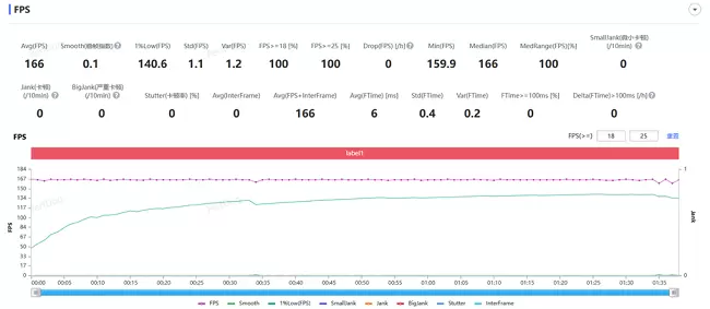 《QQ飞车》适配了165Hz高刷模式,在最高画质超高帧率模式下,在一局完整游戏中,ROG8 的帧率曲线依旧稳定,平均帧率达到了166fps。在165Hz加持下,每一次漂移都流畅丝滑,轻松取得赢得第一。