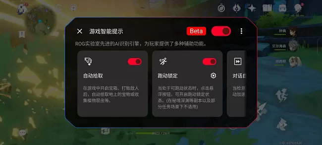 ROG 8为了提升玩家游戏体验,新加入了“游戏智能提示”“AI识屏”等功能,在《原神》等游戏中,可以帮助玩家自动跑图,加速对话等。更有“酷冷风扇X”强力外设,让你的ROG 8散热性能进一步提升22%!