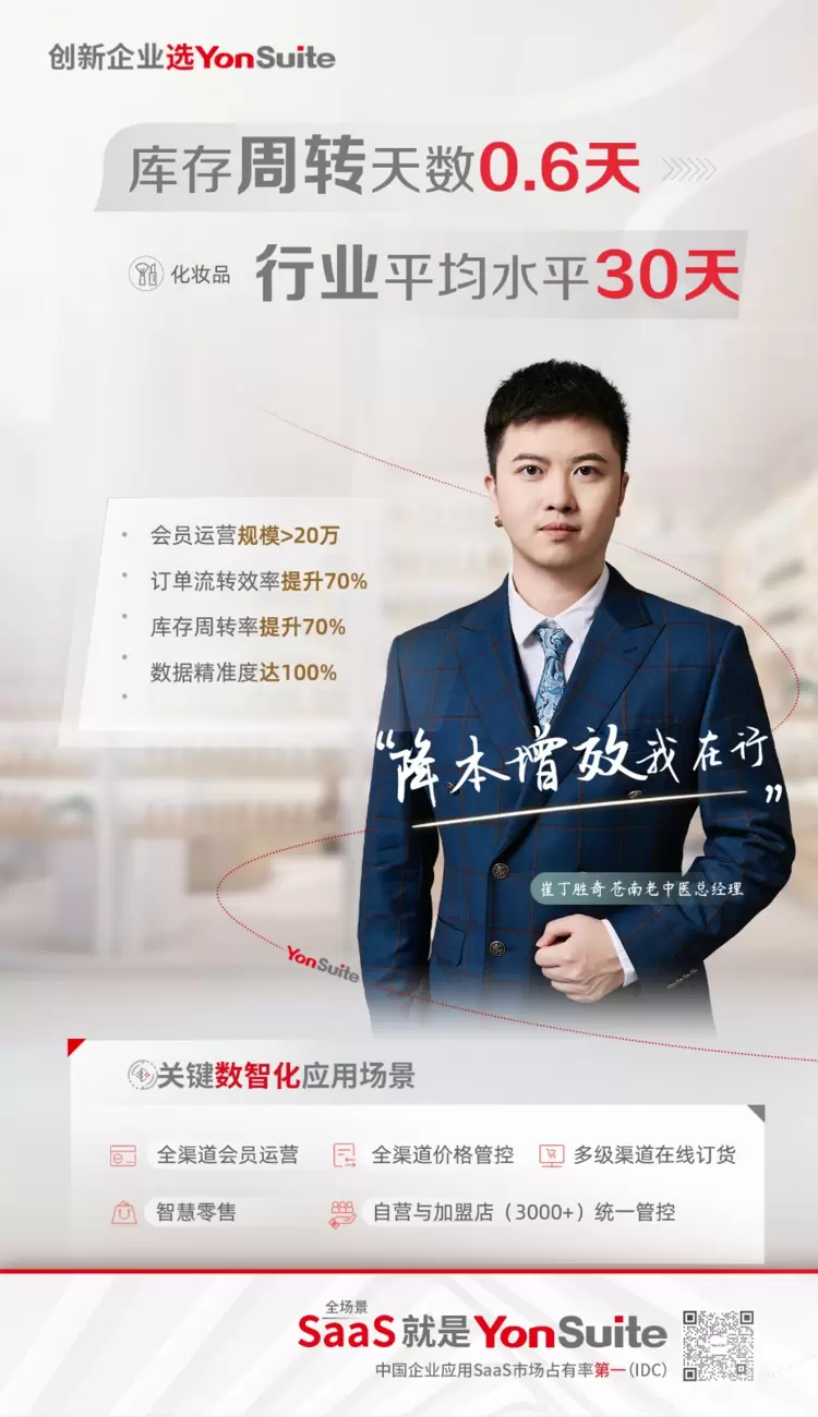以YonSuite的客户苍南老中医为例,通过YonSuite构建了一体化数智平台,实现了订单流转效率提升70%,库存周转率提升70%,数据精准度达100%,库存周转天数0.6天,要知道行业的平均水平30天,这无疑极大的企业在行业中的竞争力,把降本增效提升到了极致!