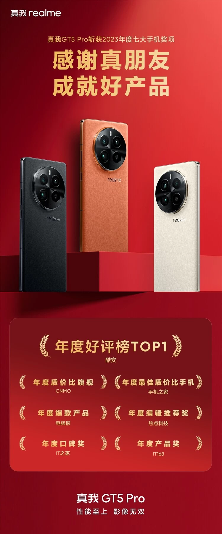 近期,真我realme的旗舰新品真我GT5 Pro斩获酷安年度好评榜TOP1、年度质价比旗舰、年度爆款产品、年度口碑奖等2023年度七大手机奖项。凭借“产品力超越同档,价格超越期待”的超高质价比,真我GT5 Pro赢得了媒体和用户的广泛认可,也因此成为2024新年最值得买的手机。
