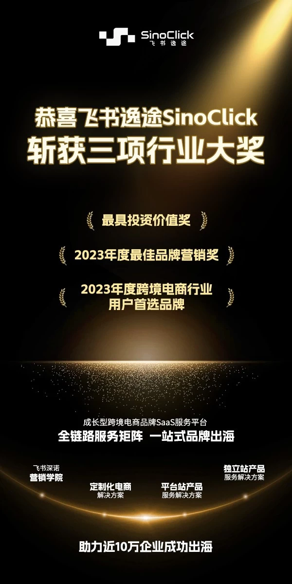 2024年新年伊始,跨境电商行业年终盛事不断。凭借在品牌出海服务领域的综合实力,飞书逸途SinoClick一举斩获三大行业奖项,包括山海奖“2023年度最佳品牌营销奖”、第四届ChinaGo跨境电商奖“最具投资价值奖”、山东跨协“2023年度跨境电商行业用户首选品牌”等荣誉称号。