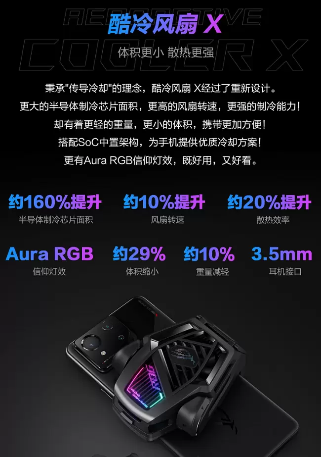 针对有着长时间游戏需求的极客玩家和专业电竞者,ROG还特别打造了酷冷风扇X,其可通过手机侧边接口连接,实现散热效率更进一步。相比于前代产品,全新的酷冷风扇X的半导体制冷芯片面积提升约160%,风扇转速也提升了10%,散热效率提升约20%,从而大幅减少手机内的热量堆积,发挥出更强劲的游戏性能。同时酷冷风扇X的组件设计更加紧凑,体积缩小了约29%,重量减轻了10%,日常游玩体验更加轻松。