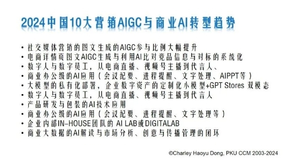 最后,董浩宇提出了他对于2024中国营销AIGC与商业转型10个预测。(如下图)