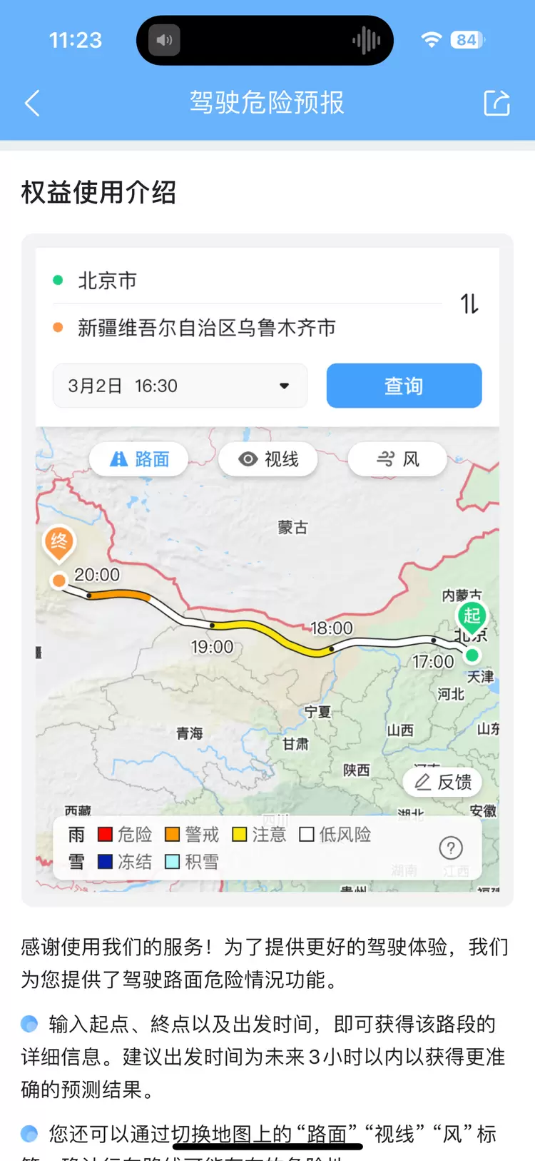 春运期间铁路车票紧俏,也有不少人选择自驾出行。据预测和分析,2024年预计72亿人次自驾出行。考虑到自驾出行的朋友最担心的路况问题,墨迹天气驾驶危险预报,可根据用户的出行线路规划方案,实时检测气象数据分析路面、视线、风力等情况,提示用户合理安排出行。无论是大雾、结冰还是拥堵,都能提前做出预警,陪伴用户安全驾驶抵达目的地。