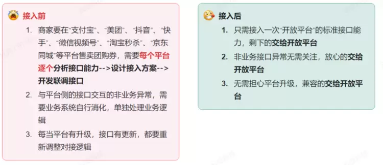 以当下热门的“本地⽣活团购”为突破点,抽象出核心环节与关键业务节点,以寻求帮助品牌快速接入各大生态的解决方案,打造“功能可复制”、“部署轻量化”的新产品形态。生态云现已打通微信、支付宝、美团、抖音、快手、等主流平台的本地生活团购业务,将“商品管理”“购买权益”“兑换权益”等流程,封装到⼀个应⽤包中,品牌商家仅需要⼀次接⼊,就可以与各个平台实现业务交互。