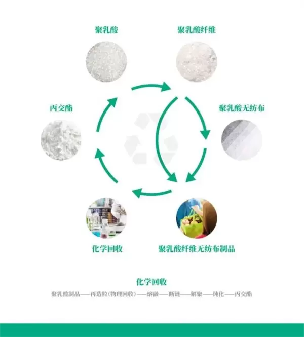 “从回收的层面,我们可以根据废料的品质从三个方向进行:工业废料等品质比较好废料可以重新造粒做物理回收,比如瓶片料,重新造粒后甚至可以用作纤维原料,或是经助剂改性后作降级使用。对于一些在使用和废弃过程中已经有一定程度降解,分子量下降比较多的废料,可以通过化学回收将废料分解成单体,然后再重新聚合生产聚乳酸,或者是跟乙醇反应做成乳酸酯。而对于品质非常差,物理和化学回收都不具有经济性的的废料,则可以通过工业堆肥进行生物回收,降解成二氧化碳和水,再次参与光合作用。物理回收、化学回收的有机结合,可能是未来聚乳酸生产一个很重要的原料来源。”杨义浒提出。