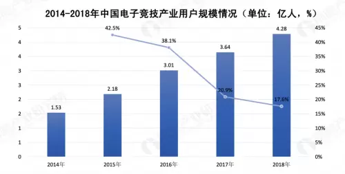 据此前前瞻产业研究院发布的《中国电子竞技产业研究报告》显示,从2014~2018年期间,中国电竞产业用户规模从1.53亿人增长到4.28亿人,增加近2.8倍;而电竞产业规模也从2016年的532亿元增长到912亿元,增长71%。